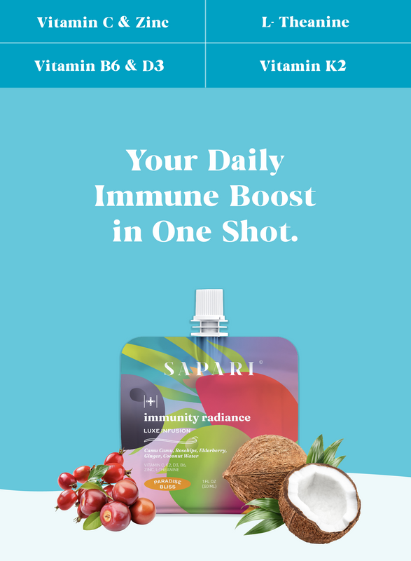 Elevate your wellness with Sapari Immunity Radiance, a sophisticated, all-in-one 1oz shot designed to fortify immunity, enhance vitality, and promote total well-being. Crafted with a potent blend of Camu Camu, Elderberry, Ginger, Rosehips, Vitamin C, D3, K2, B6, Zinc, and L-Theanine, this refined elixir streamlines your routine—no more juggling multiple supplements. Infused with the exotic Paradise Bliss flavor, Immunity Radiance is your effortless, on-the-go solution for staying strong, radiant, and energized—whether tackling busy mornings, traveling, or simply prioritizing your well-being.